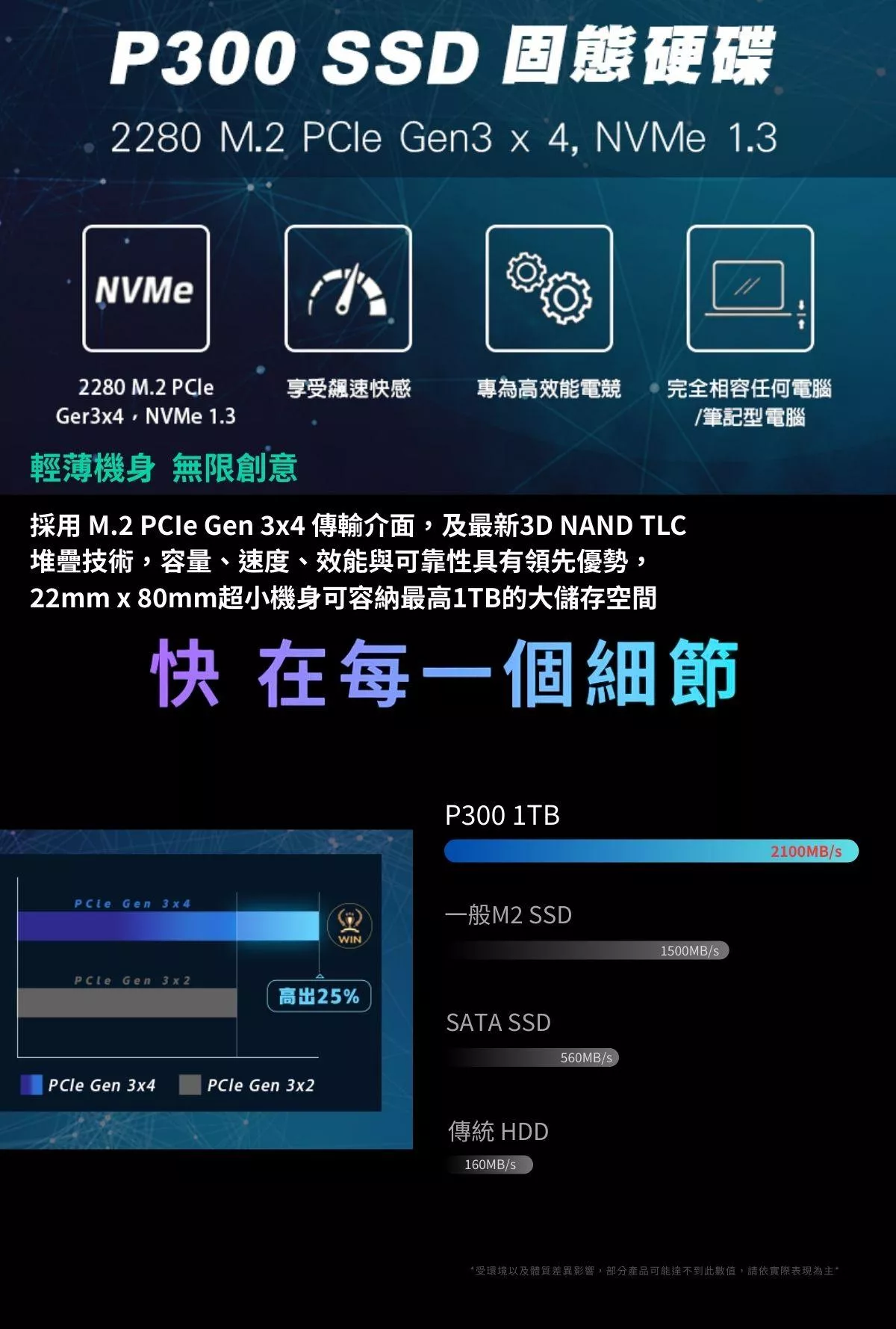 1TB : 美商博蒂 P300 1TB (讀 : 2100MB/s 寫 : 1650MB/s)