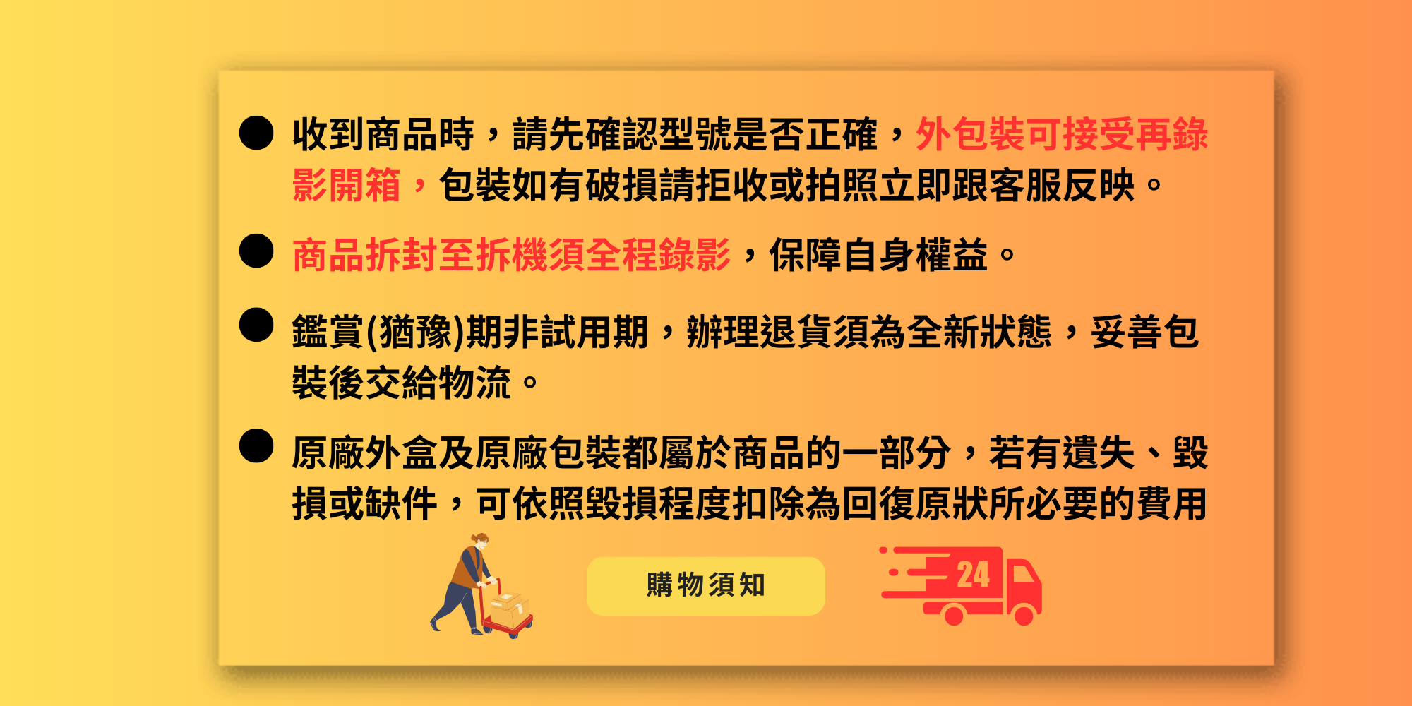 📌拆封請全程錄影為了保障雙方權益,請您在開箱過程中務必全程錄影,以確保商品是否遺漏。寄錯、缺貨、瑕疵品等,請皆以「完整錄影檔」為依據,(從外送箱未開封的完整狀態開始拍攝才是完整錄影檔)。影片需清楚拍攝【未拆封狀態】、【開箱過程】、【物件本體】、【貨品明細】等。影片需提供「原檔清晰開箱影片」,快轉或有明顯剪輯痕跡的影片皆不在受理範圍。